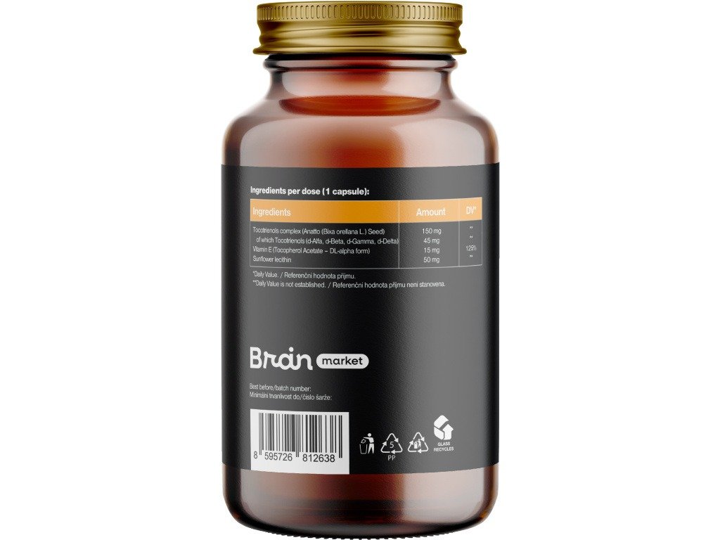 Zloženie: Komplextokotrienolov (ako Annatto (Bixa orellana L.) semeno) (150 mg, RHP **), z toho tokotrienoly (ako d-Alfa, d-Beta, d-Gamma, d-Delta) (45 mg, RHP **), Vitamín E (ako tokoferol acetát – DL-alfa forma) (15 mg, RHP 125 %). Rastlinná kapsula na báze HPMC. Neobsahuje žiadne balastné látky (éčka).