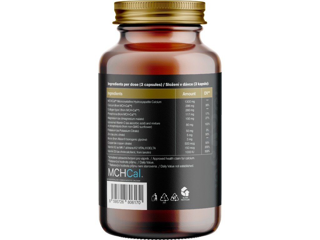 Zloženie: MCH-Cal™ mikrokryštalický hydroxyapatit vápenatý, vápnik (z MCH-Cal™), kolagén typu I (z MCH-Cal™), fosfor (z MCH-Cal™), horčík (ako dimagnézium malát), lipozomálny vitamín C (ako kyselina askorbová) a zmes fosfolipidov (z non-GMO slnečnice), draslík (ako citrát draselný), zinok (ako citrát zinočnatý), bór (z Albion® boroorganický glycín), meď (ako citrát meďnatý), vitamín K2 ako MK-7 all-trans K2 VITAL®DELTA, vitamín D3 (ako cholekalciferol, z lanolínu). Rastlinná kapsula na báze HPMC. Bez obsahu balastných látok.