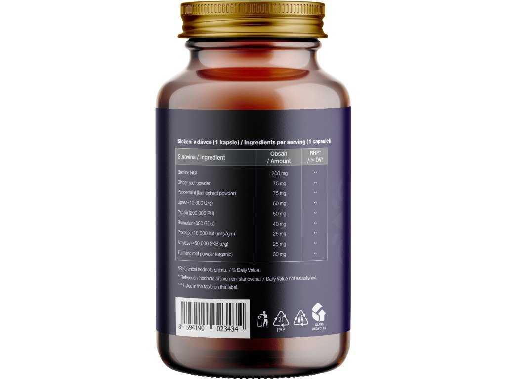BrainMax Digestive Magic obsahuje amylázu, ktorá štiepi škroby a sacharidy na cukry, proteázu, ktorá má na starosti štiepenie bielkovín na aminokyseliny a lipázu, ktorá štiepi tuky na glycerol a mastné kyseliny. Zmes je obohatená o betain, bromelaín a papaín (z ovocia papája alebo ananásu), čo sú prírodné tráviace enzýmy, ktoré sa bežne používajú v súvislosti s rozkladom bielkovín v strave. Enzýmy sme obohatili o koreň zázvoru, kurkumy a listy mäty, ktoré prispievajú k normálnemu tráveniu.