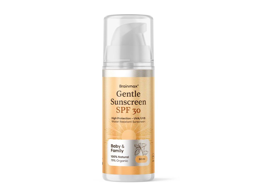 BrainMax Gentle Sunscreen Lotion SPF 30 je jemný, vodeodolný minerálny opaľovací krém, ktorý poskytuje spoľahlivú ochranu pokožky pred UVA a UVB žiarením. Vďaka čisto prírodnému zloženiu bez chemických UV filtrov je vhodný pre dospelých aj deti, citlivú pokožku aj každodenné použitie celej rodiny. Ochrana je založená na oxide zinočnatom bez nanočastíc, ktorý na pokožke vytvára mikroskopickú ochrannú vrstvu. Tá pomáha zachytiť a rozptýliť slnečné žiarenie ešte predtým, než prenikne do hlbších vrstiev pokožky. Krém je obohatený o rastlinné oleje a vitamín E, ktoré pomáhajú starať sa o pokožku počas pobytu na slnku.