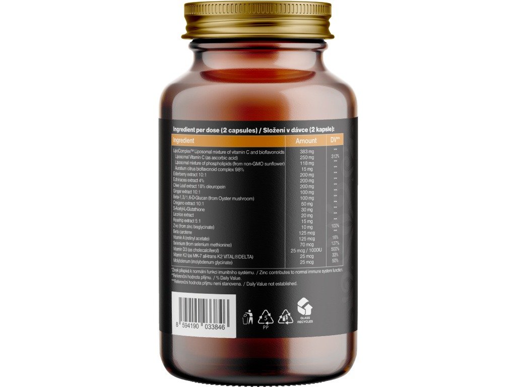 Zloženie: LipoComplex™ Liposomálna zmes vitamínu C a bioflavonoidov (lipozomálny vitamín C ako kyselina askorbová), fosfolipidy z non-GMO slnečnice, citrusové bioflavonoidov Auratium 98%) extrakt z bazy 10:1, extrakt z echinacey 4 %, extrakt z olivových listov 18% oleuropeín, extrakt zo zázvoru 10:1, Beta-1,3/1,6-D-glukán (z hlivy ustricovej), S-acetyl-L-glutatión, extrakt zo sladkého drievka, extrakt z oregana 10:1, extrakt zo šípky 5:1, zinok (z bisglycinátu zinočnatého), beta karotén, vitamín A (retinyl acetát), selén (zo selén metionín), vitamín D3 (ako cholekalciferol), vitamín K2 (vo forme MK-7 all-trans K2 VITAL®DELTA), molybdén (z glycinátu molybdénu).