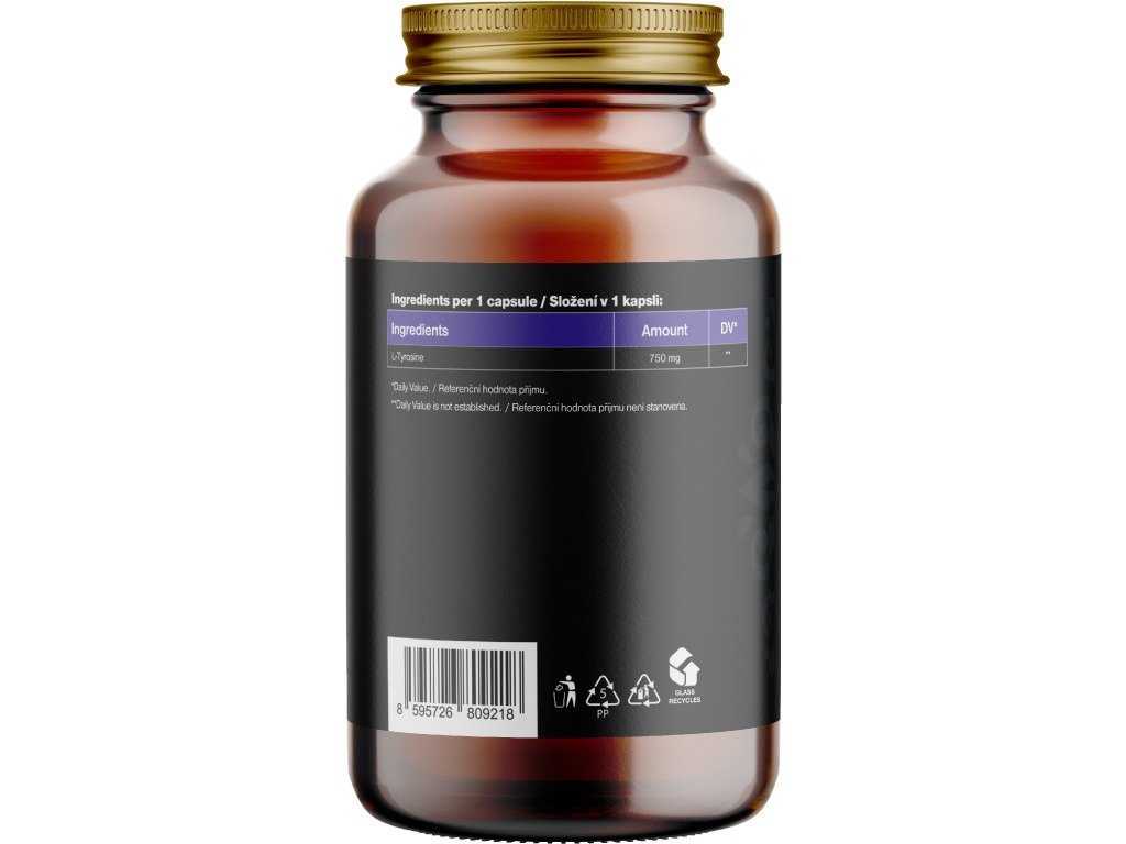 Zloženie: L-Tyrosine 750 mg, rastlinná kapsula na báze HPMC. Neobsahuje žiadne balastné látky.