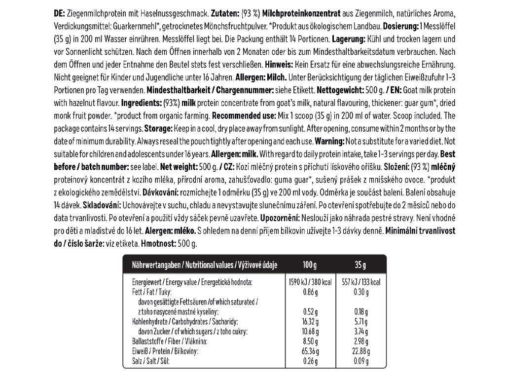 Zloženie: (93 %) mliečny proteínový koncentrát z kozieho mlieka, prírodná aróma, zahusťovadlo: guarová guma*, sušený prášok z mníšskeho ovocia. *produkt z ekologického poľnohospodárstva. Alergén: mlieko.