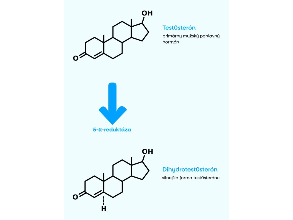 Prostata je mimoriadne citlivá na mužské pohlavné hormóny, najmä test0sterón a jeho aktívnejší metabolit dihydrotest0sterón (DHT). DHT vzniká premenou testosterónu pomocou enzýmu 5-α-reduktázy priamo v prostatickom tkanive a je hlavným spúšťačom rastu prostaty. Tento proces je úplne prirodzený hlavne u mužov po päťdesiatke, ale môže spôsobovať časté močenie, slabý prúd moču alebo pocit neúplného vyprázdnenia. Je to úplne bežné u mužov po päťdesiatke, pretože s vekom sa zvyšuje aktivita enzýmu 5-α-reduktázy, čo má za následok väčšie množstvo DHT v prostate.