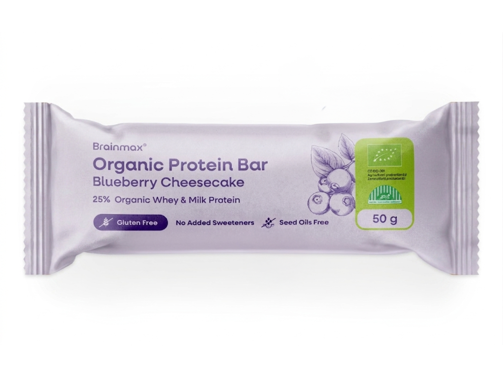 BrainMax Blueberry Cheesecake Protein Bar, BIO, 50 g Proteínová tyčinka s príchuťou čučoriedkového cheesecake / *CZ-BIO-001 certifikát