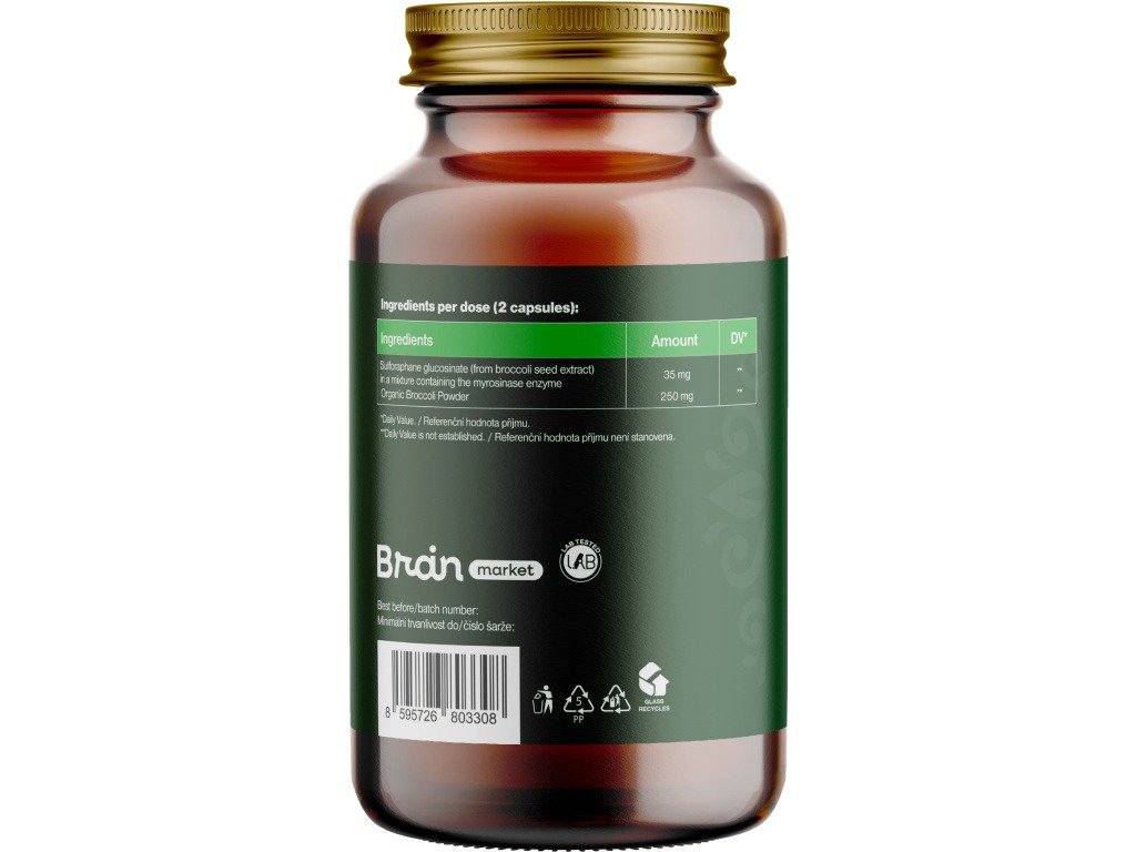 Zloženie: Sulforafan glukosinát (z extraktu semien brokolice - Brassica oleracea) vo vlastnej zmesi obsahujúcej enzým mirosinázy 35 mg, brokolicový prášok BIO 250 mg. Rastlinná kapsula na báze HPMC.