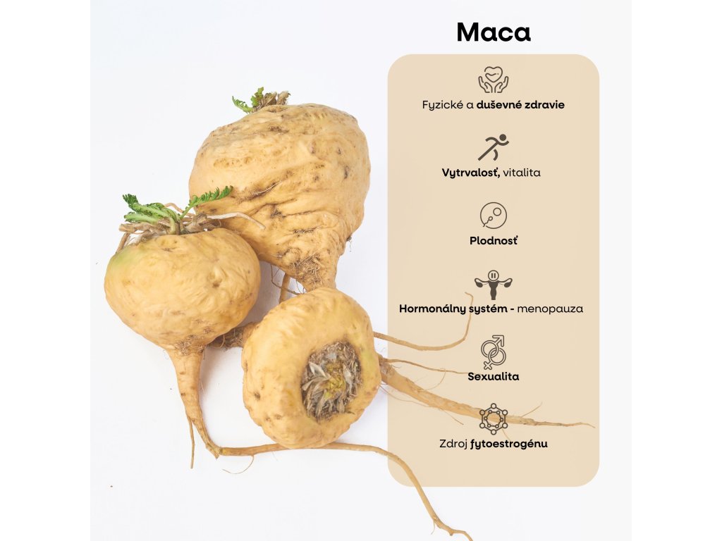 Superpotravina, ktorá sa po generácie používa na podporu fyzického i duševného zdravia, vytrvalosti a vitality. Maca prispieva k plodnosti, sexualite a zdravému hormonálnemu systému, ktorý u mužov podporuje rovnováhu osi hypotalamus-hypofýza-gonády, ktorá reguluje hormonálnu produkciu. U žien podporuje celkovú hormonálnu rovnováhu, čo je obzvlášť cenené v období menopauzy. Vďaka obsahu fytoestrogénov, ktoré na rozdiel od tých v sóji nemajú estrogénny účinok, skôr moduluje hormonálne reakcie tela, a práve preto je obľúbená u ľudí so zvýšenou záťažou.