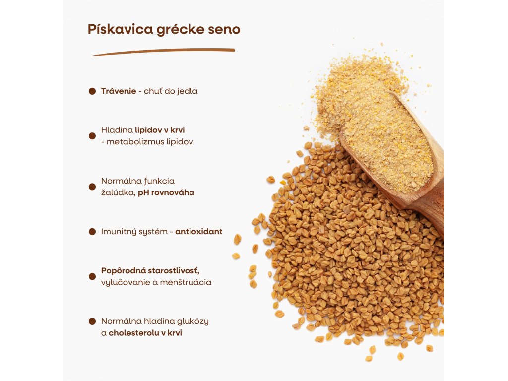 Synergická zmes senovka gréckeho sena a Curcuglio orchioides. Pískavica je zastúpená extraktom s obsahom 18% protodioscínov. Pískavica je známa svojim širokým spektrom účinkov na trávenie a stimuláciu chuti do jedla, podporuje normálnu funkciu žalúdka a prispieva k udržaniu pH rovnováhy. Vďaka svojim antioxidačným vlastnostiam sa podieľa aj na správnej funkcii imunitného systému.
