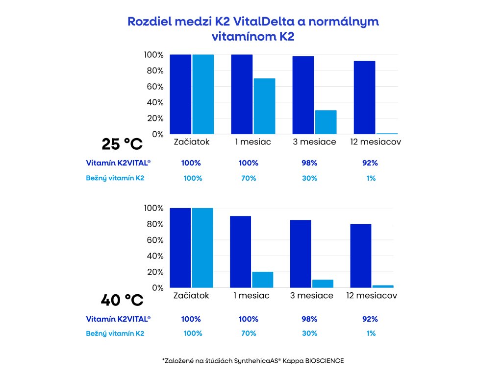 K2VITAL®DELTA MK7 je v porovnaní s ostatnými bežnými vitamínmi K2 oveľa stabilnejší pri bežných aj vyšších teplotách, a ani po niekoľkých mesiacoch nepodlieha tak rýchlo biodegradácii ako iné formy vitamínu K2.
