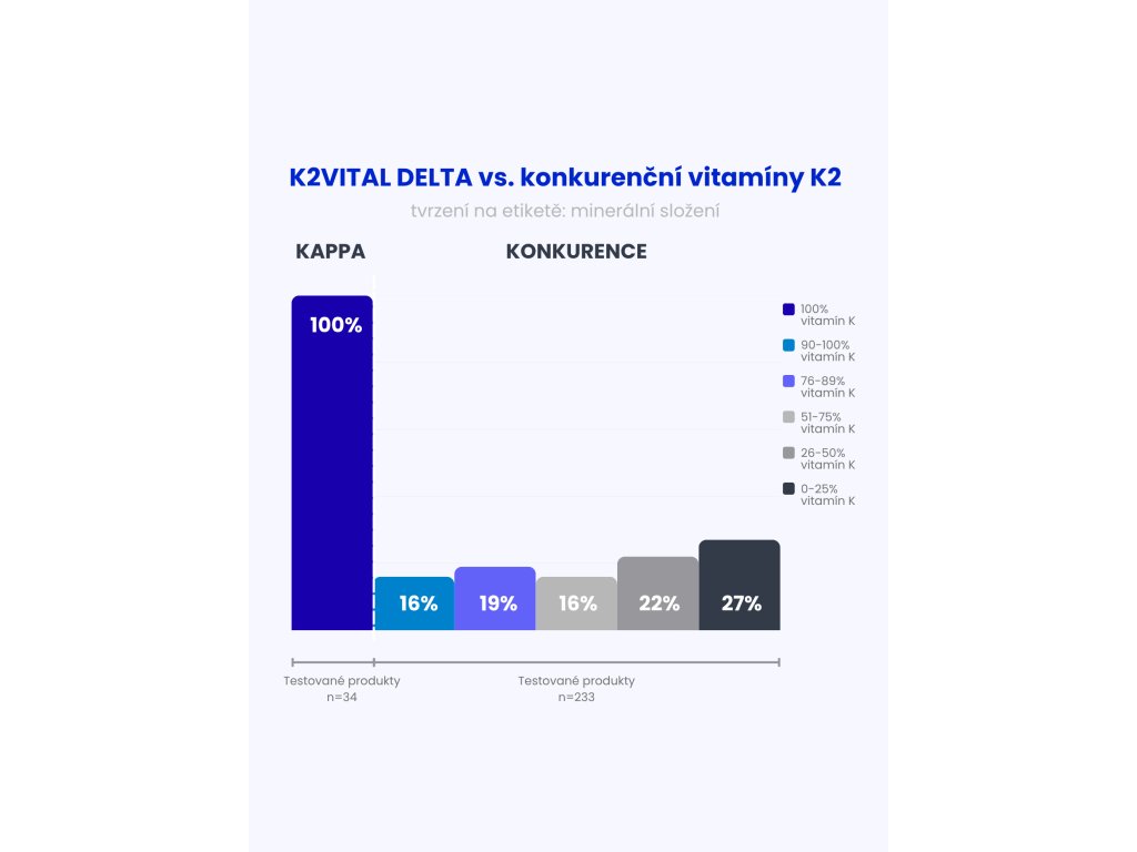 Spoločnosť Kappa vykonala aj prieskum kvality, stability a účinnosti vitamínu K2 v doplnkoch stravy v neminerálnych kombináciách, kde by stabilita nemala byť problém. Polovica týchto neminerálnych produktov s vitamínom K2 mala problémy s kvalitou , pričom celá jedna tretina vzorky nevykazovala žiadny merateľný obsah Vitamínu K2 (nula). V pätine produktov bol zmeraný obsah vitamínu K2 v rozmedzí 26–75% oproti deklarovanému množstvu na etikete. Iba u štvrtiny produktov zodpovedalo namerané množstvo vitamínu K2 množstvo na etikete .