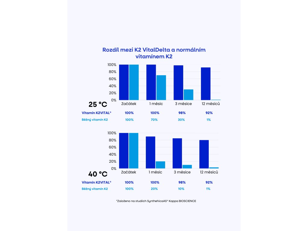 K2VITAL®DELTA MK7 je oproti ostatným bežným vitamínom K2 oveľa stabilnejší pri bežných aj vyšších teplotách, a ani po niekoľkých mesiacoch nepodlieha tak rýchlo biodegradácii ako iné formy vitamínu K2.