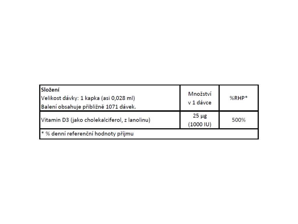 Vitamín D3 (ako cholekalciferol, z lanolínu) | 25 μg (1000 IU) | 500% |