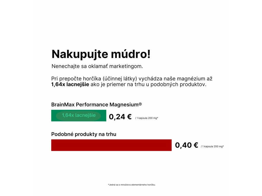 Pri prepočte horčíka (účinnej látky) vychádza naše magnézium až 1,64x lacnejšie ako je priemer na trhu u podobných produktov