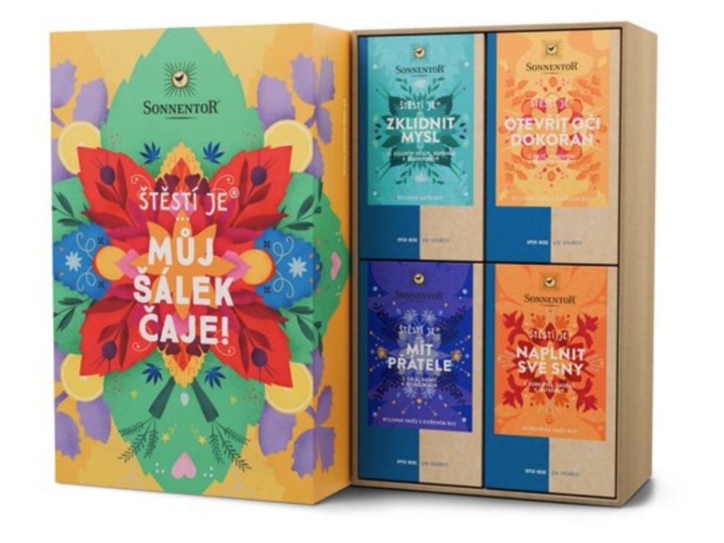 Sonnentor - Darčeková kazeta čajová, Šťastie je moja šálka čaju! Darčekové balenie štyroch BIO čajov