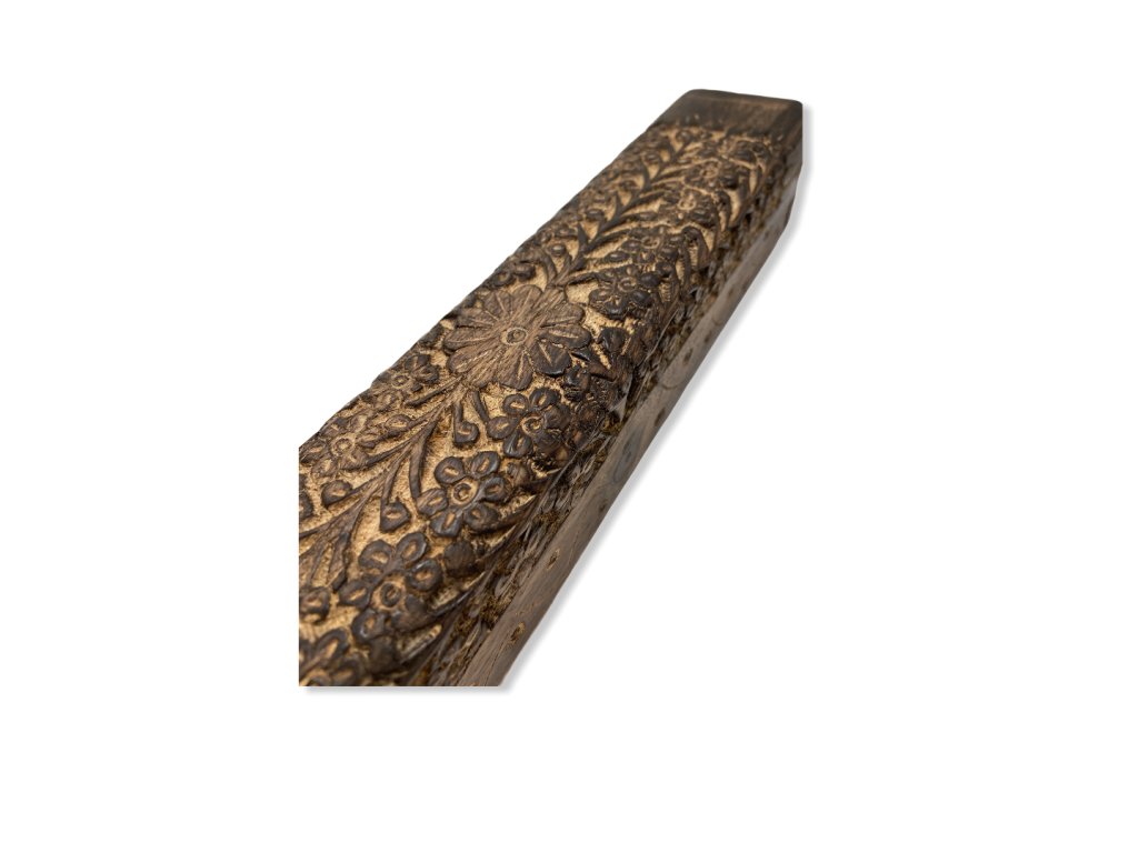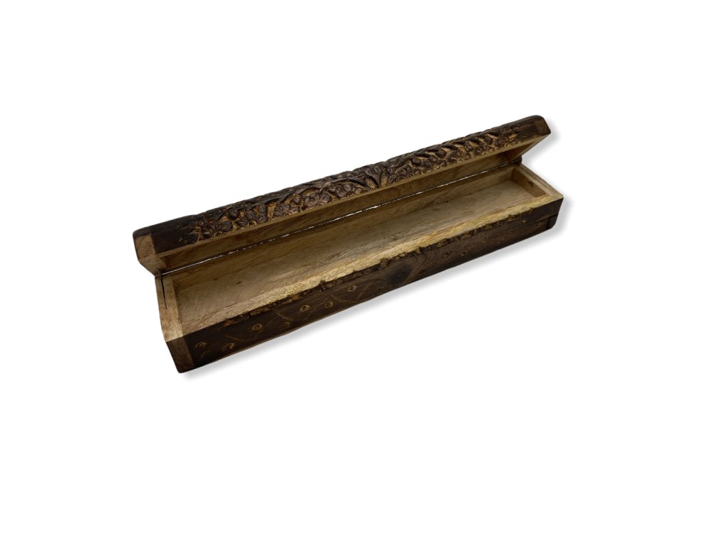 Precízne vyrezávaná skrinka na pálenie vonných tyčiniek s bambusovou štiepok. Ide o jedinečný remeselne prepracovaný výrobok z dreva mangovníka.